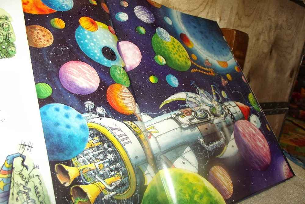 Dalej jest całe mnóstwo, pięknych, bogatych w szczegóły ilustracji. W pierwszym momencie  dostałam oczopląsu na widok tylu drobnych elementów. A to zasługa ciemnego tła ( bo w końcu w nocy lecieli) i jasnych szczegółów.