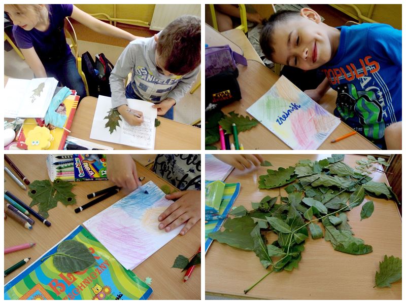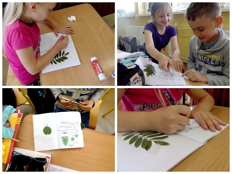 Dlatego też, w inny dzień zawitałam na kolejne zajęcia byśmy mogli skończyć nasze prace. Fajnie dzieci współpracowały, dzieliły się zdobytą wiedzą, uzupełniały sobie nawzajem. W efekcie powstały na prawdę fajne Zielniki, które część dzieciaków mówiła że uzupełnią je jeszcze innymi liśćmi znalezionymi blisko domu! A gdy im zabraknie mają stworzyć nowe zeszyty i dalej się bawić i zdobywać wiedzę. Takie zachowanie cieszy najbardziej!W naszych Zielnikach znalazły się takie drzewa jak dąb czerwony, klon jawor, wierzba, olcha, lipa, jarząb, kasztanowiec i inne.