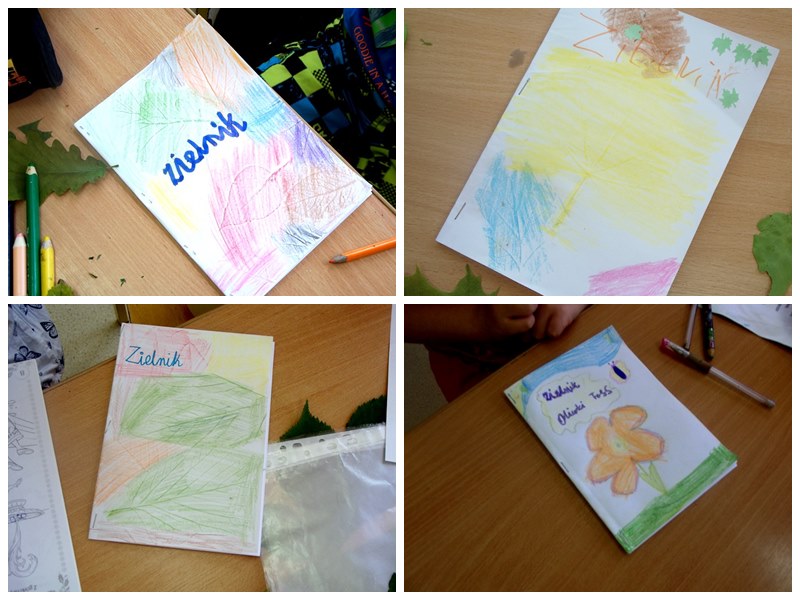 Przygotowaliśmy sobie szybko zeszyty do wklejania liści okolicznych drzew. Każdy otrzymał swój własny ( kilka kartek z bloku rysunkowego złożyłam na pół i z boku spięłam zszywaczem ) mogliśmy więc przystąpić ozdabiania Zielników. Było różnorodnie, kolorowo i pięknie!